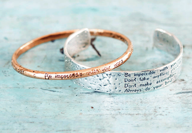 The universe answered with a collaboration with Janet Mills and don Miguel Ruiz for the best-selling book The Four Agreements. I created a line of jewelry engraved with all of The Four Agreements on it and through the medium of jewelry, I create wearable touchstones for this incredible wisdom to help others transform their own lives and relationships in positive ways.